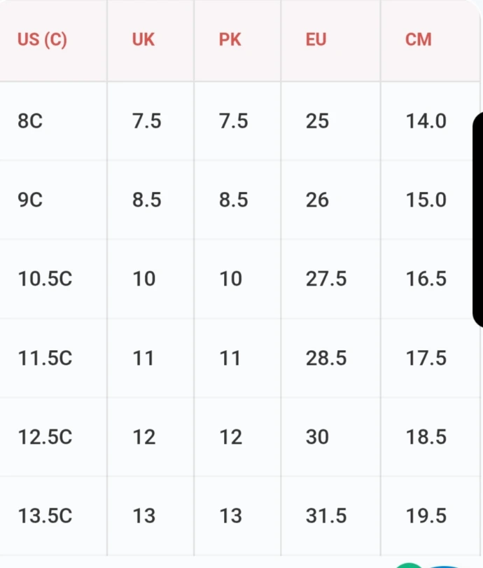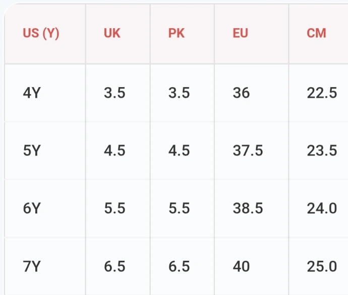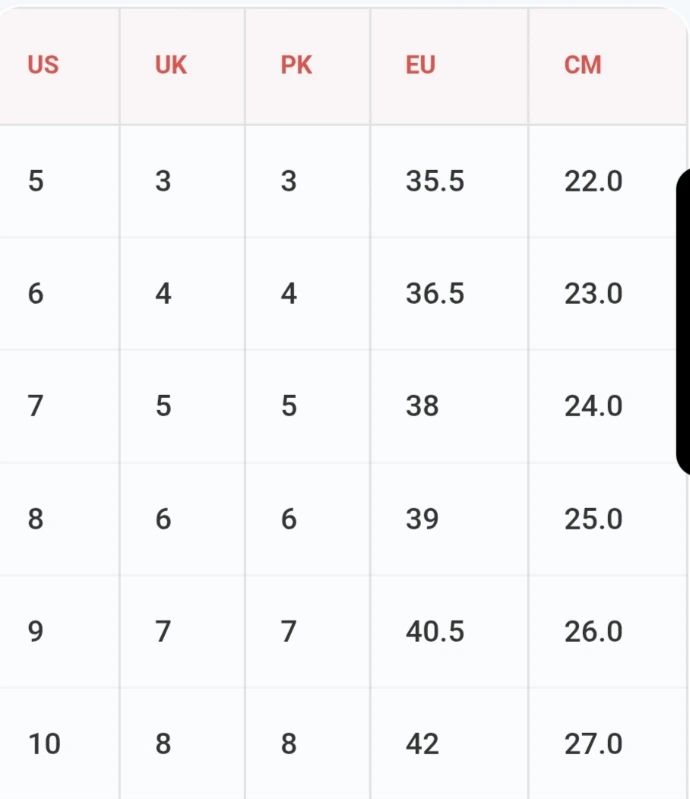 خواتین کے لیے: یو ایس (US) سائز، یوکے اور پاکستانی سائز سے 2 نمبر بڑا ہوتا ہے (UK/PK 5 = US 7)۔