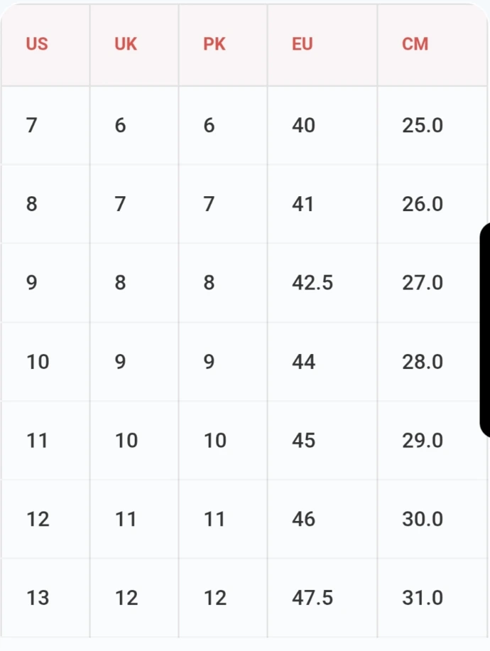 مردوں کے لیے: یو ایس (US) سائز، یوکے اور پاکستانی سائز سے 1 نمبر بڑا ہوتا ہے (UK/PK 8 = US 9)۔